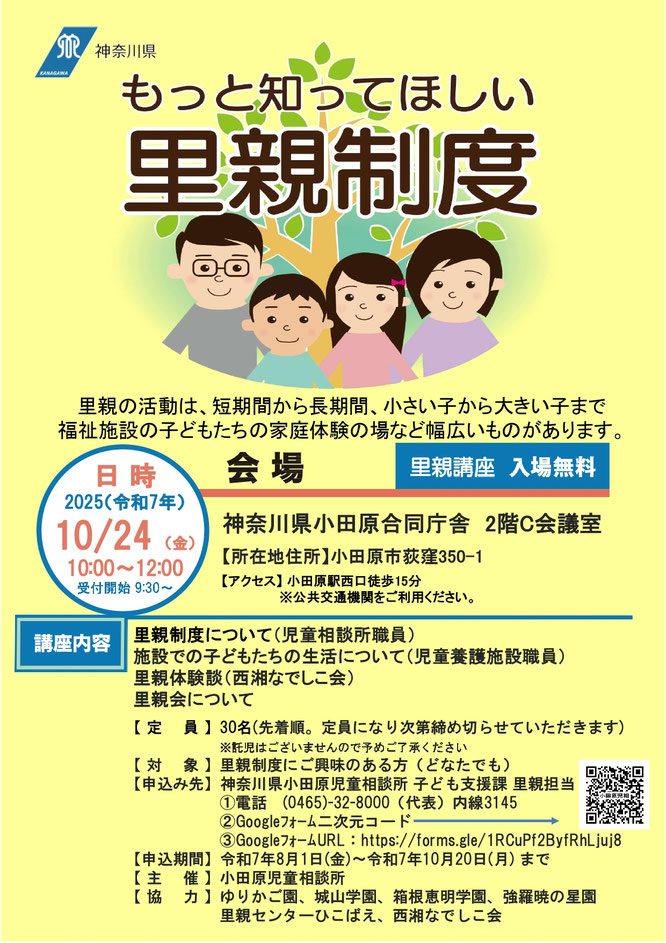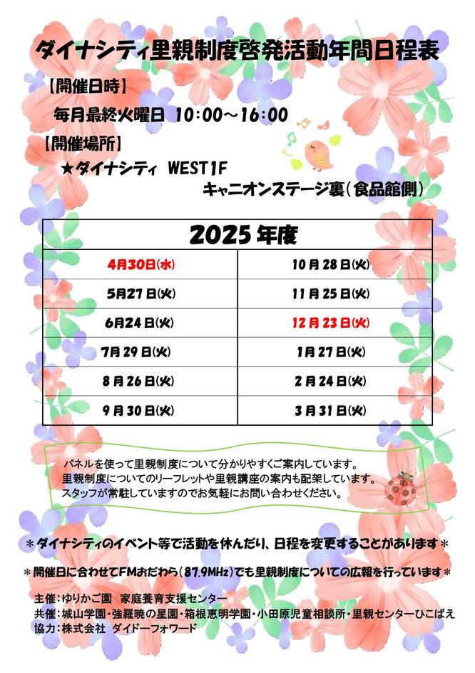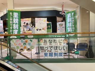 『児童養護施設 ゆりかご園』の家庭養育支援センターは、小田原のダイナシティで、里親制度をたくさんの方に知ってもらうための活動をしています。里親制度について分かりやすく展示している他、児童養護施設の職員もいるので、気軽に声をかけて下さい。